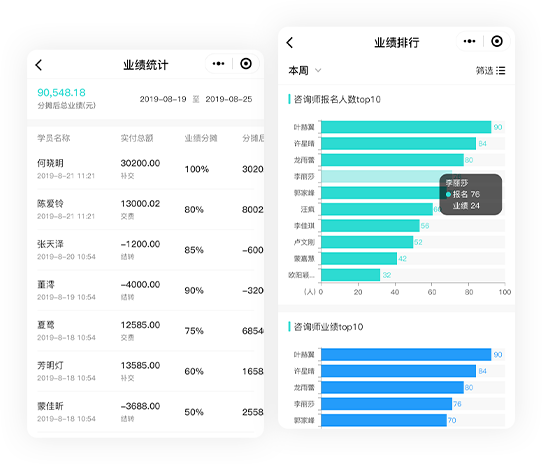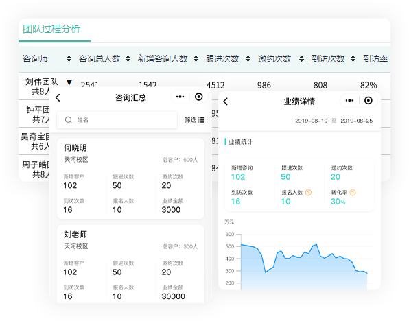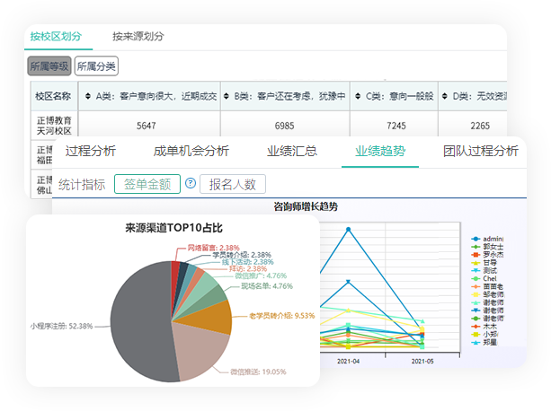 系统自动统计销售人员阶段业绩及排名,智能汇总分析生成业绩趋势图表,方便校区进行经营评估与业绩考核
