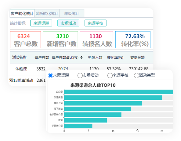 销售人员新增客户数、跟进次数、试听安排人数、报名人数等售销过程数据自动汇总,并生成试听率、报名率等关键销售指标