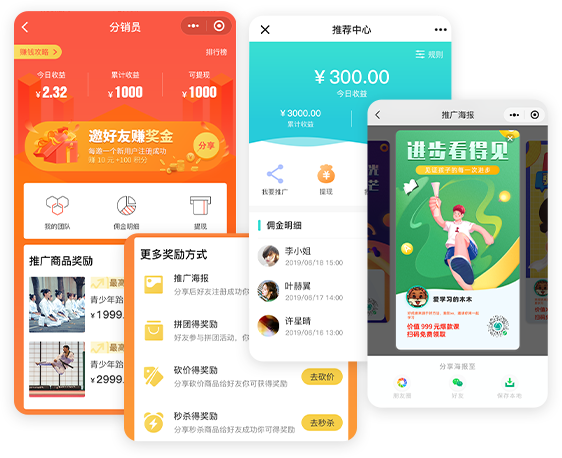 报名、交费、购课/物均可返佣,多重激励,刺激学员参与推荐
