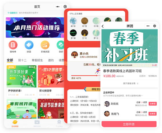 优惠拼课,多人成团老带新,熟人效应实现精准引流、快速报名成交