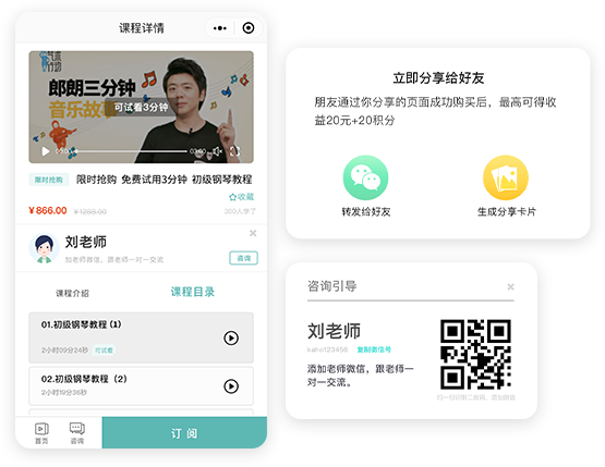 分享课程链接,可获得推荐佣金,促进社交裂变传播,实现老带新快速引流